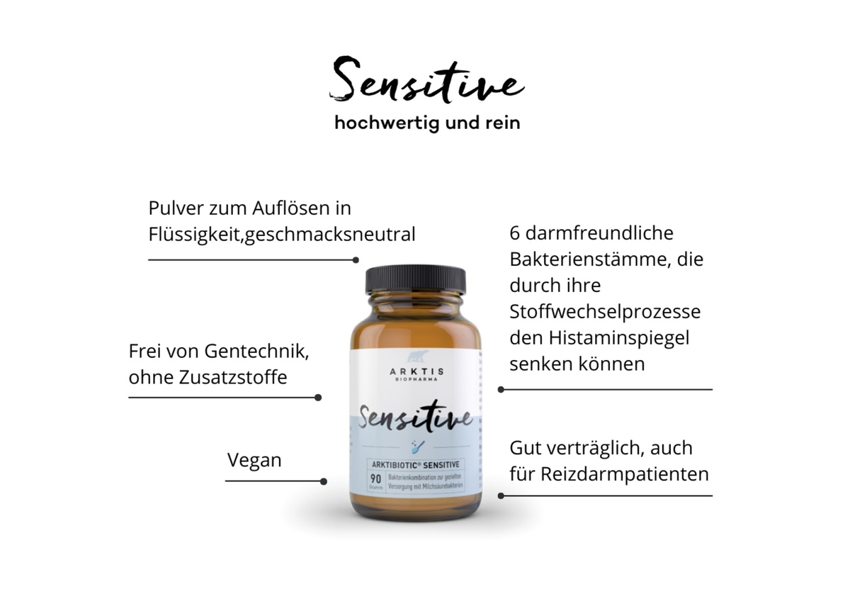 2 x Arktibiotic Sensitive (90g): Bakterienkulturen, die das Darmmilieu positiv beeinflussen und Histamin senken können.